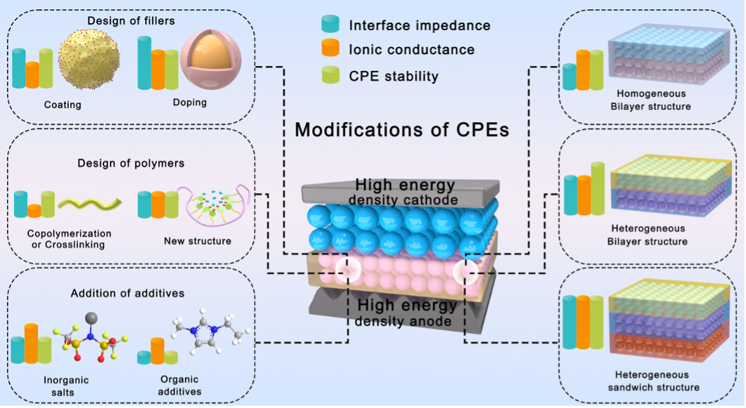 聚合物复合电解质(PCEs)在提升电池安全性、稳定性和能量密度方面具有显著优势,是实现高能量密度储能系统的关键材料之一。然而,PCEs在实际应用中仍面临严峻的界面挑战,尤其是在高电压或高能量密度体系中,界面不稳定、副反应频发及界面相容性差等问题更为突出,严重制约了离子传导效率与电池整体性能。因此,系统分析高能量密度条件下的关键技术瓶颈,并提出针对性解决方案,对推动下一代储能系统发展具有重要意义。尽管已有策略在改善界面性能方面取得了一定成效,但其在高能量密度电池体系中的适用性仍有待进一步验证。