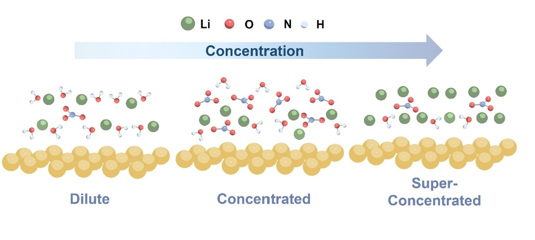 为深入解析界面微观结构,研究团队结合分子动力学模拟(MD)与从头算分子动力学(AIMD)方法,构建了电极/电解液界面的原子模型。在最佳浓度与工作电位下,界面区域呈现出独特的双层有序结构:下层为有序的3Li⁺·NO₃⁻平面,其中Li⁺的配位作用削弱了N-O键,降低反应活化能;上层为垂直取向的NO₃⁻,通过与水分子形成氢键显著提升了H₂Oₙ=₂比例。如图2所示,浓度效应进一步验证了该机制的普适性。值得注意的是,该机制在稀释或过高浓电解液中均无法有效形成:前者因离子数目不足,后者因LiLi⁺水化链锁定水分子网络。