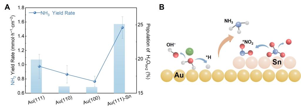 基于上述机制,研究团队提出了两种电极优化策略:一是通过调控单晶电极晶面,利用不同晶面零电荷电位(PZC)的差异调节电场强度。其中,Au(111)表面因其最正的PZC值,在负电位下可形成更强的表面电场,更有利于驱动LiLi⁺与NO₃⁻的定向排布。性能测试表明,不同晶面的氨产率顺序为Au(111) > Au(110) > Au(100)),与其PZC排序一致。二是通过Sn修饰构建异质界面,在Au(111)表面自发吸附Sn原子形成Au(111)-Sn结构,可进一步优化反应路径。Sn的引入提高了H₂ON=2比例,使质子传递效率倍增。理论模拟表明,Sn吸附引起电子结构重新分布,降低了NO₃⁻解离的活化能。